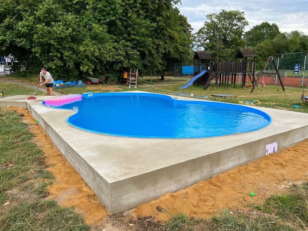 Nachdem der alte Pool abgerissen und ausgebaggert wurde, wurde er inzwischen komplett neu aufgebaut und eingefasst. Nach drei Monaten Bauzeit (von Mitte April bis Mitte Juli 2023) durch viele viele Stunden Arbeit freiwilliger Helfer, konnte er pünktlich zum Zeltlager gebührend eingeweiht werden. Jetzt steht dem Poolvergnügen in den nächsten mindestens 50 Jahren nichts mehr im Wege - höchstens das Wetter ;-).
